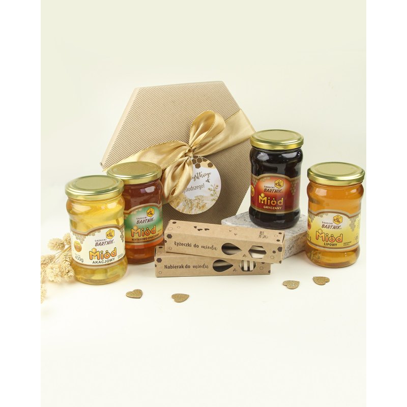 Chcesz podarować komuś miód ale nie wiesz w co go zapakować? Dobrze trafiłeś - eleganckie pudełko ze złotą wstążką i zawieszką do wyboru to nowość jaką stworzyliśmy z myślą o obdarowaniu kogoś słodkim prezentem. Wyszedł z tego prosty elegancki zestaw - prawdziwa rozkosz dla zmysłów i podniebienia. Każda okazja jest dobra aby obdarować najbliższą osobę prezentem. Oferujemy wyjątkowy zestaw z produktami najwyższej jakości.